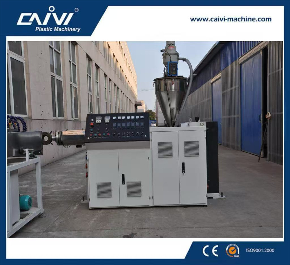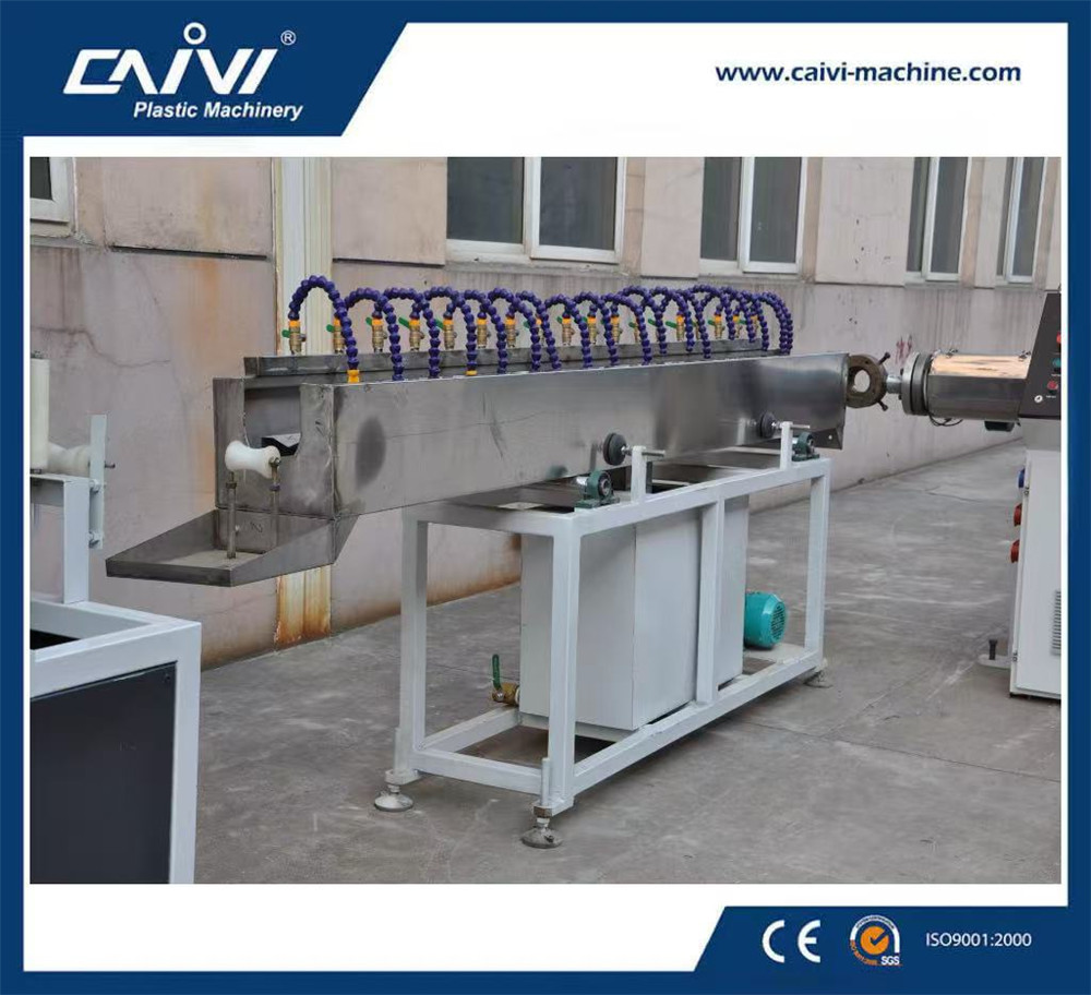 原料+助劑配制→混合→造粒→輸送上料→單螺桿擠出機→擠出模具→噴淋冷卻水箱→皮帶牽引機→編織機→預(yù)熱烘箱→單螺桿擠出機→包復(fù)模具→噴淋冷卻水箱→皮帶牽引機 →計米裝置→收卷機→成品檢測包裝
