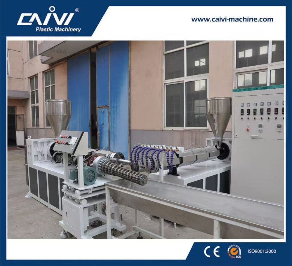 原 料+助劑配置→混合→造粒→輸送上料→單螺桿擠出機(jī)→單螺桿擠出機(jī)→共擠模具→成型機(jī)→冷卻水槽→螺旋牽引機(jī)→收卷機(jī)→成品檢驗(yàn)包裝