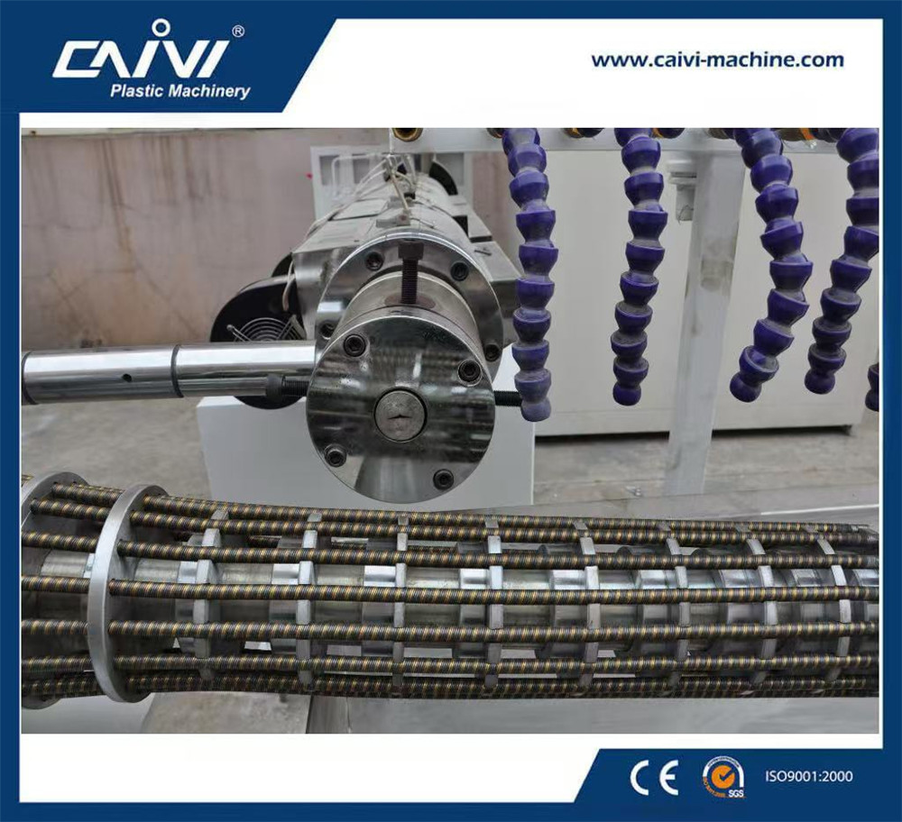 該生產(chǎn)線是用來(lái)生產(chǎn)PVC螺旋增強(qiáng)軟管的,它包括兩臺(tái)擠出機(jī)、成型機(jī)、冷水槽、收卷機(jī)。軟硬PVC螺旋增強(qiáng)管具有耐腐蝕、耐負(fù)壓、耐彎曲和良好的流通性等特點(diǎn)。因而,該管材適合于輸送氣體、液體, 也被廣泛地應(yīng)用在工業(yè)、農(nóng)業(yè)、建筑行業(yè)等領(lǐng)域